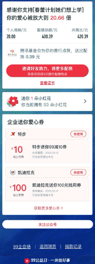 • 捐赠人对公益项目捐款后,可以领取到企业的爱心消费券。