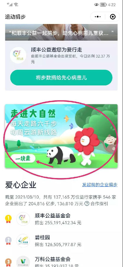 • 企业(团体)通过专属的微信小程序“一块走”,可以自己设计行走地图,定制企业品牌地标,让运动捐步更加适合公司团建,更好地管理爱心行走成员,打造爱心跑团,一边运动,一边捐赠爱心,让公益更日常更有趣!